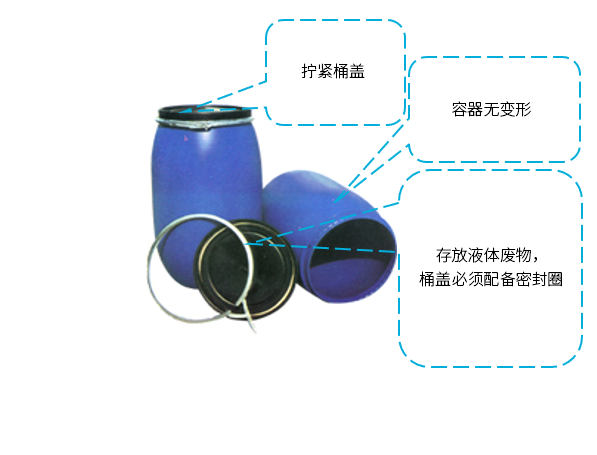 大開口桶:可存儲體積較小的固體廢物 ,液體廢料(閃點 > 65℃);粘稠的廢物需配置至少同等尺寸的內稱袋。