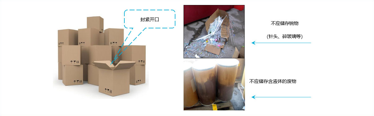 注意!不建議儲存尖銳的固體廢物(如玻璃類廢物),含少量 液體的固廢需使用含內襯的編織袋